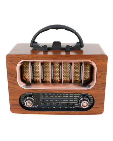 Diseño: Estilo vintage con acabado tipo madera, asa de transporte y rejilla frontal metálica