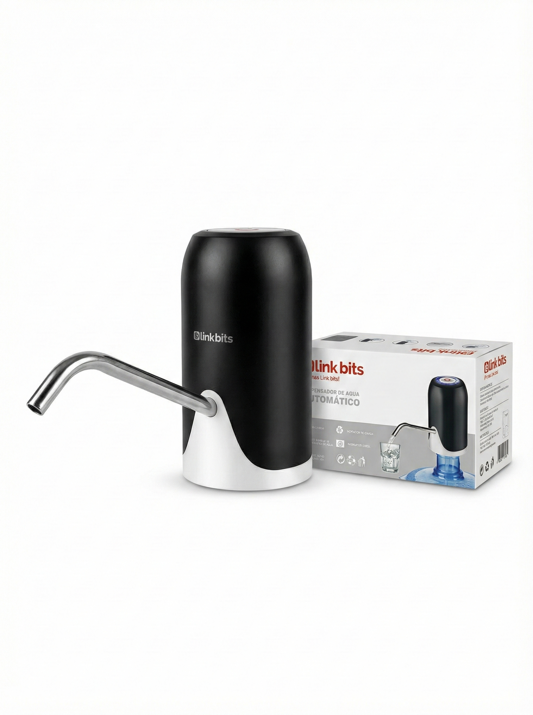 El dispensador de agua automático Link Bits FA018 es una bomba eléctrica recargable diseñada para garrafones, que permite extraer agua con solo presionar un botón, sin necesidad de levantar el garrafón ni usar bomba manual. Es una solución práctica y cómoda para hogares, oficinas, negocios o cualquier espacio donde se consume agua embotellada.